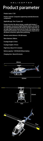 Equipped with a 2.4GHz remote system, the C138 ensures strong signal transmission and interference-free flying, even when multiple helicopters are in the air. Its altitude hold function makes hovering steady and easy, while the lightweight semi-metal frame provides durability without sacrificing performance.